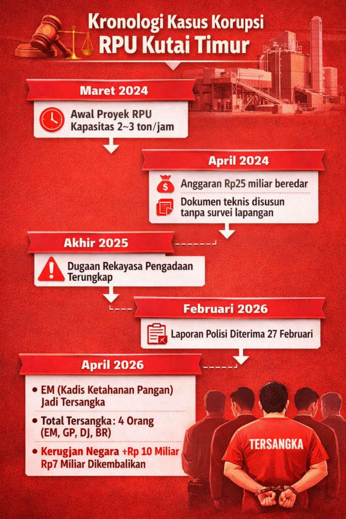 Kasus ini sebelumnya telah lebih dulu mencuat pada akhir 2025, ketika Polda Kaltim mengungkap dugaan permainan anggaran dalam proyek pengadaan RPU milik Dinas Ketahanan Pangan Kutai Timur Tahun Anggaran 2024.